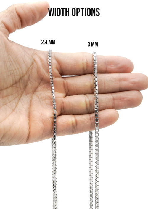 Pure Silver (925) Box Chain with Rhodium bonded 6 times to provide optimum quality. These chains are fully customizable, so you can pick your length and width above. Once you selected your length and width, you can see the adjusted gram weight below the price.