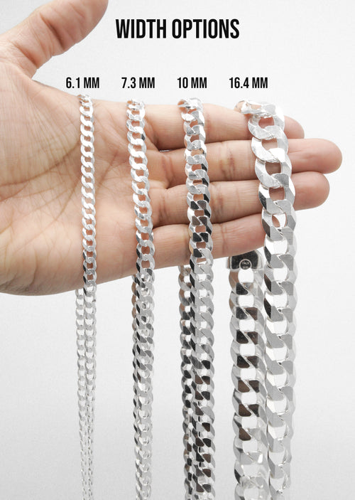 Pure Silver (925) Curb Chain with Rhodium bonded 6 times to provide optimum quality. These chains are fully customizable, so you can pick your length and width above. Once you selected your length and width, you can see the adjusted gram weight below the price.
