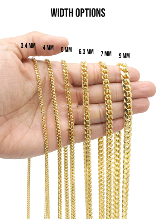 Pure 925 Silver Miami Cuban Link Chain which has been gold bonded over 6 times with 14K Gold for premium quality and durability. These chains are fully customizable, so you can pick your length and width above. Once you select your length and width, you can see the adjusted gram weight below the price.